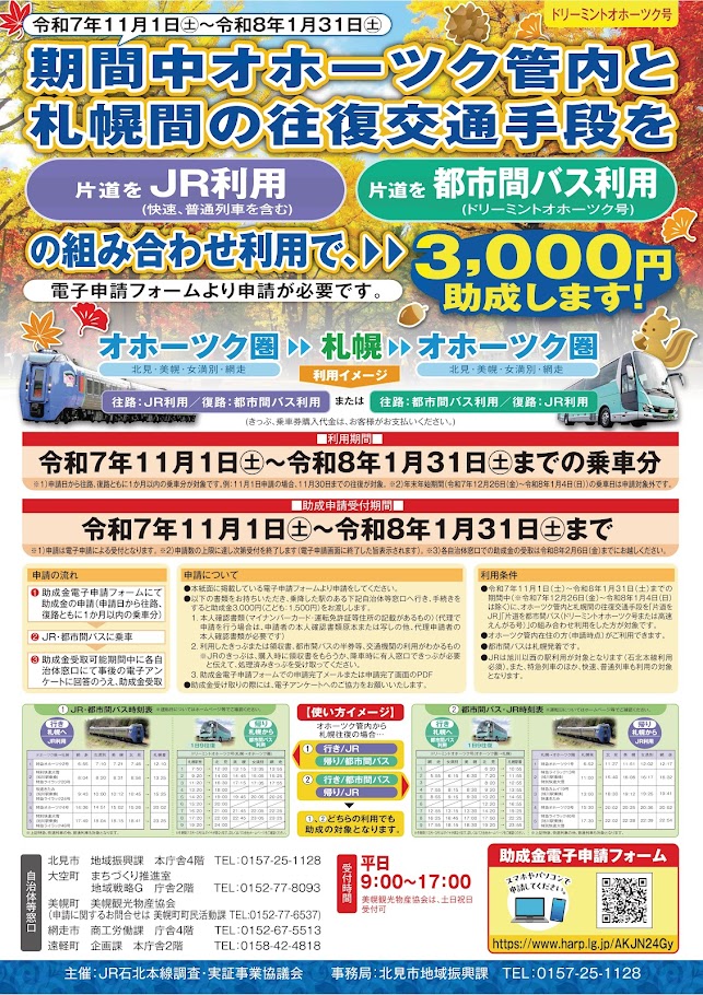 - 令和7年11月1日から令和8年1月31日までの期間中(令和7年12月26日から令和8年1月4日は除く)に、オホーツク管内と札幌間の往復交通手段を「片道JR」「片道都市間バス」の組み合わせを利用した方がご利用できます。
